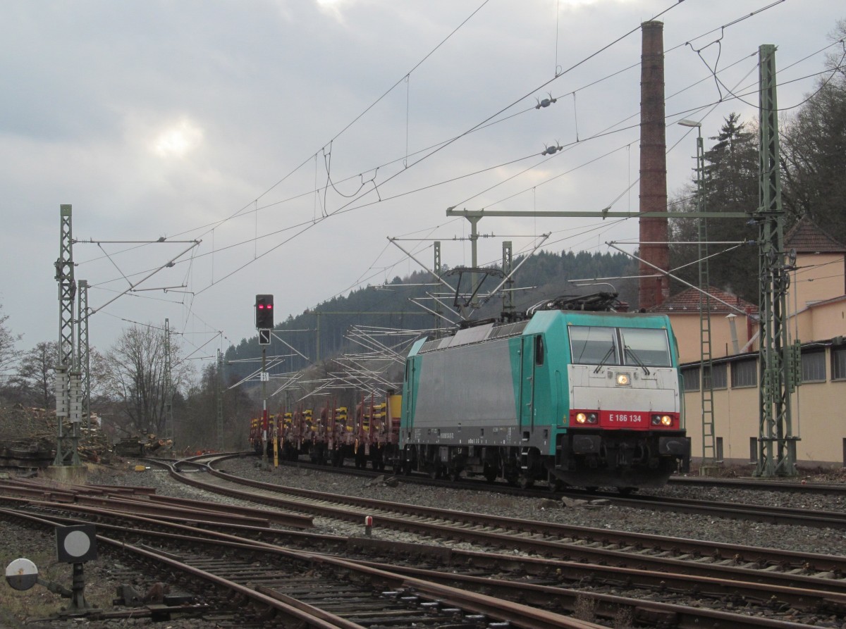 Am 17.02.14 brachte E94 192 die 142 130-4 und die 140 438-3 von Nördlingen nach Dessau. Hier bei kurzem Aufendhalt in Saalfeld/Saale.