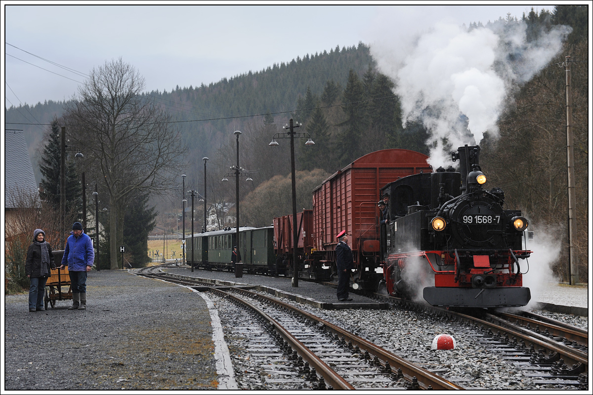 99 1568 mit einem Foto GmP und Seppl und Max mit ihrem Pferdefuhrwerk im Vordergrund am 15.2.2014 in Steinbach bei Jöhstadt aufgenommen.