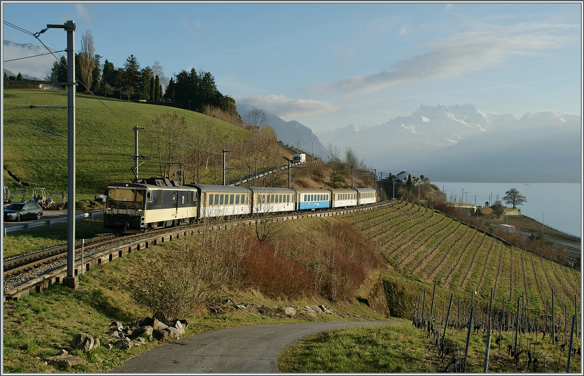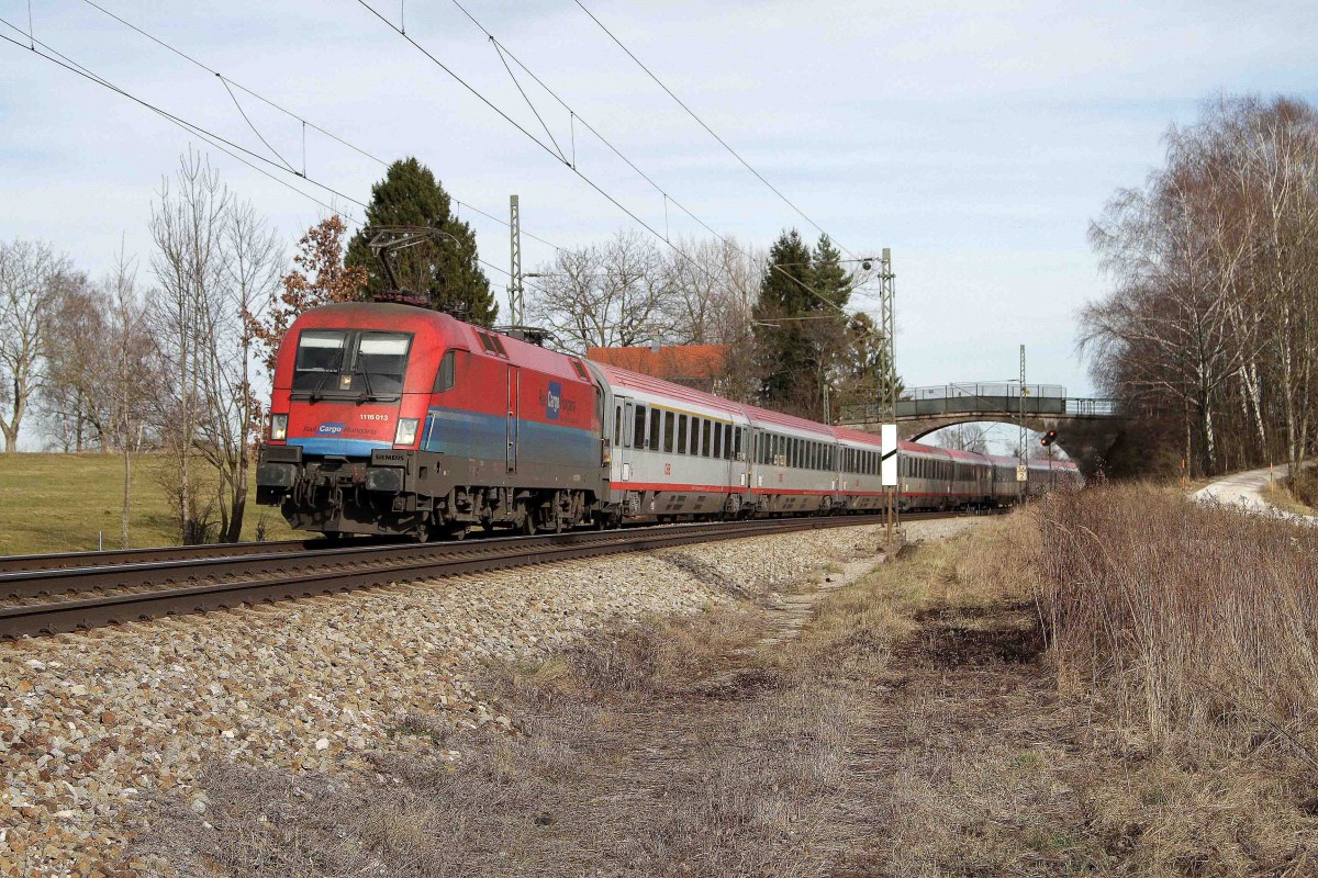 Die 1116 - 251 mit dem Austria Skizug und einem Railjet bei Ufering am 15.02.2014