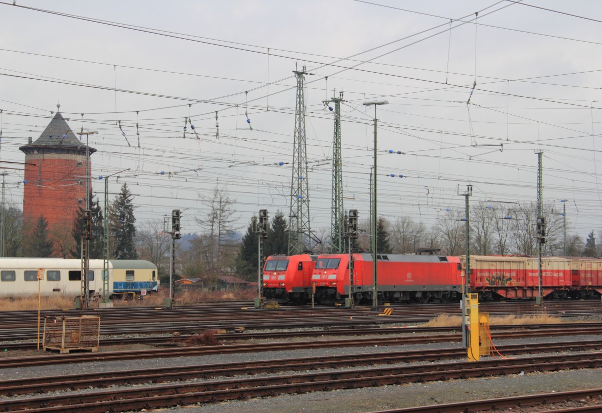 Blick auf den Bahnhof Lichtenfels mit dem ehemaligem Wasserturm und der wartenden 185 051-0 und 152 091-5 am 19.02.2014.