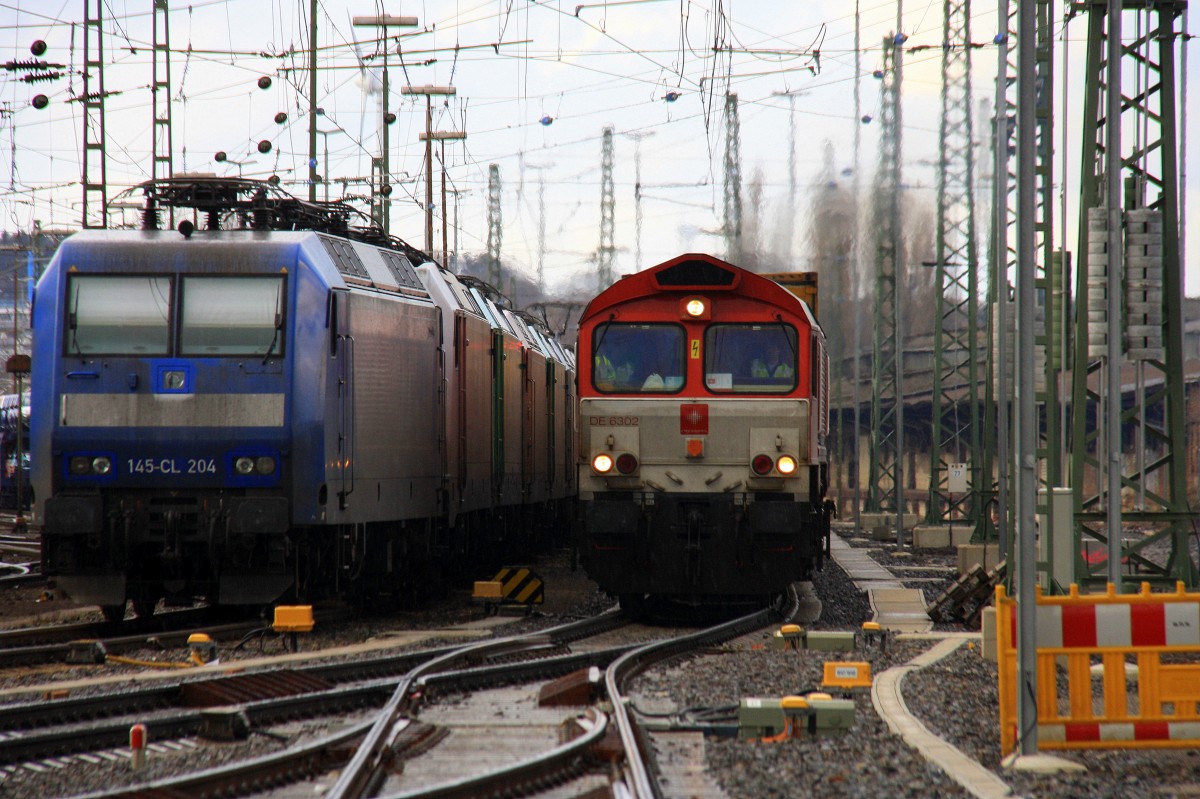 Ein Nachschuss von der Class 66 DE6302  Federica  von Crossrail kommt als Lokzug aus Montzen(B) und fährt in Aachen-West ein und auf dem Nebengleis eine 145 CL-204 von Crossrail steht mit 8 E-Loks von Crossrail stehen auf dem Abstellgleis in Aachen-West bei Regenwolken am Nachmittag vom 16.2.2014.