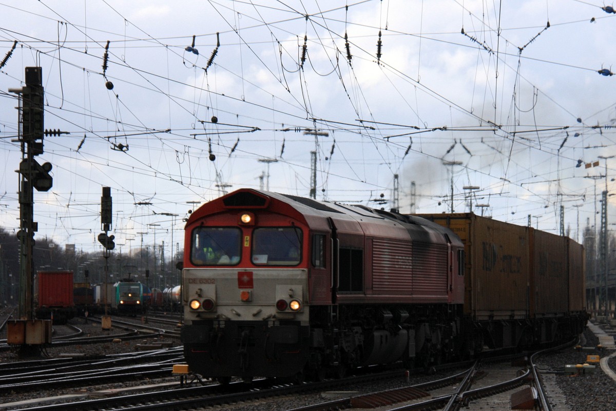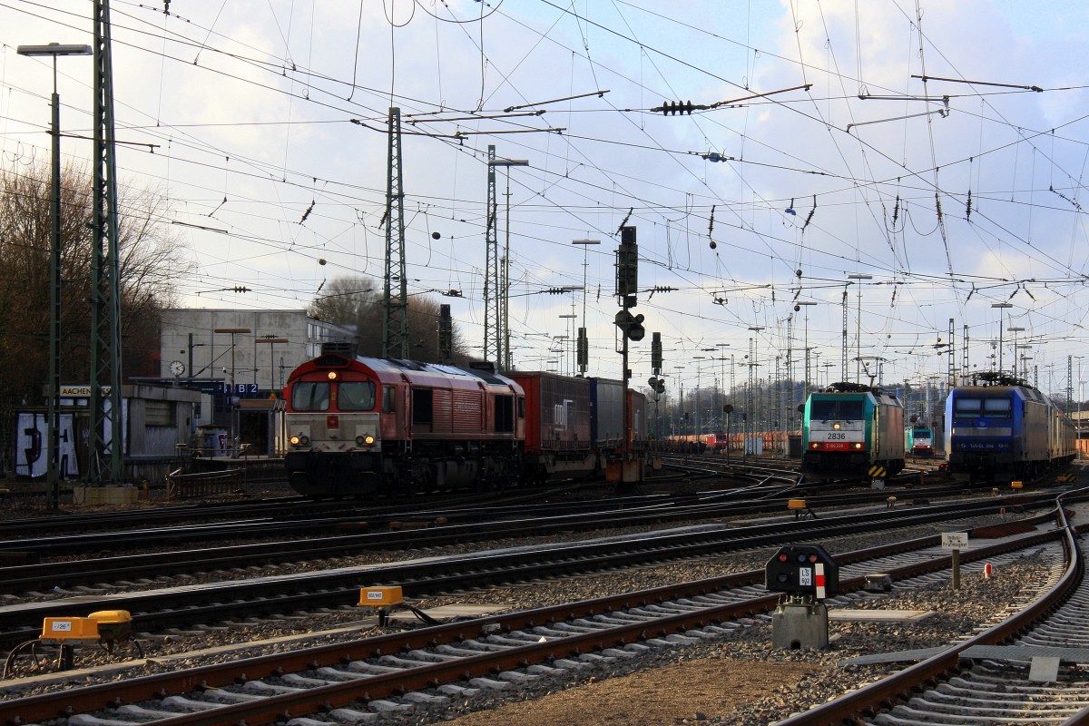 Die Class 66 DE6312 "Alix" von Crossrail fährt mit einem langen Containerzug aus Segrate(I) nach Zeebrugge-Ramskapelle(B) bei der Ausfahrt von Aachen-West und fährt in Richtung Montzen/Belgien und im Hintergrund steht die 145 CL-204 von Crossrail mit 8 E-Loks von Crossrail stehen auf dem abstellgleis in Aachen-West und die Cobra 2836 rangiert in Aachen-West bei Sonne und Regenwolken am Nachmittag vom 16.2.2014.