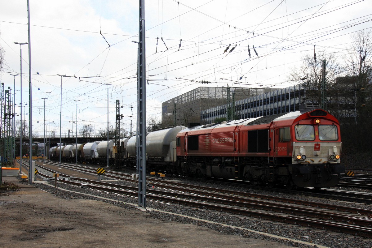 Die Class 66 DE6312 "Alix" von Crossrail kommt aus Richtung Montzen/Belgien mit einem Kurzen Silozug aus Herentals(B) nach Buna-Werke(D) und fährt in Aachen-West ein bei Sonne und Regenwolken am Nachmittag vom 16.2.2014.