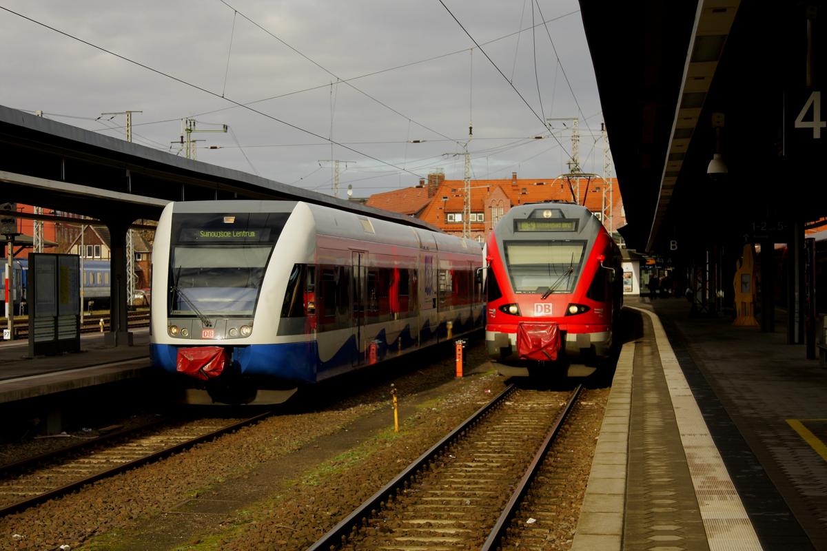 Usedomer Bäderbahn und ein moderner Flirt, 429026 der DB, treffen sich am 13.02.2014 um 10.59 Uhr im Bahnhof Stralsund. Beide Fahrzeuge fahren auf Ostseeinseln. Die UBB fährt nach Usedom bis zum polnischen Swinemünde. Der Flirt fährt nach Binz auf die Insel Rügen.
