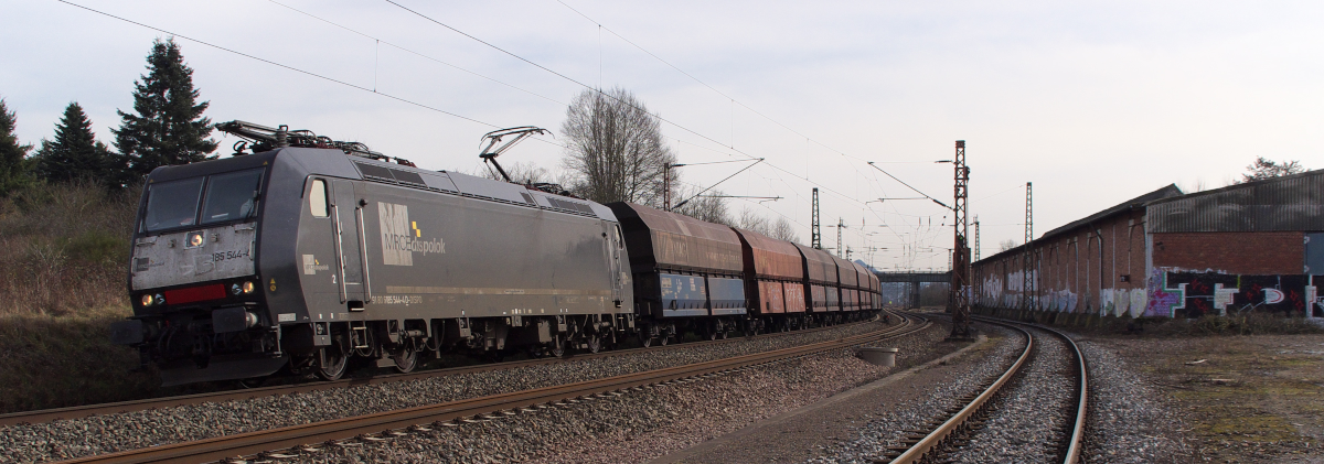 Zurück ins Ruhrgebiet...bringt 185 544-4 ihren leeren NIAG-Zug. Entweder aus Bexbach oder Göttelborn kommt die Fuhre um Kohlenachschub für die Kraftwerke im Saarland zu holen. Hier in Bous passiert der Zug das Gelände des Stahlwerkes Bous (früher Mannesmann Röhrenwerke). In der Halle rechts befand sich früher das Außenlager des DB Brückenlagers in Karthaus. Das Gleis neben mir ist das Ausziehgleis der Stahlwerke Bous, hinter mir gibt es einen Prellbock, sodass die Stelle gefahrlos ist und ebenso frei zugänglich. In den 1990er Jahren wurden auch hier E 94 Krokodile zerlegt! 18.02.2014 - Bahnstrecke 3230 Saarbrücken - Karthaus