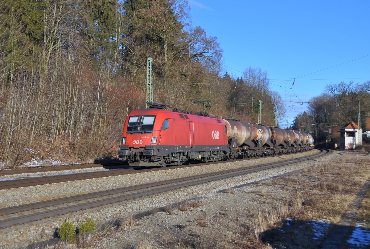 1116 281 mit Kesselwagen in Richtung Österreich.Aufgenommen in Aßling am 6.2.2014