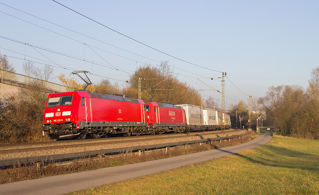 Die moderne Bahn - 185 250-8 glänzt im Abendlicht des 31. Januar 2014, als sie zusammen mit einer weiteren Lok der Baureihe 185 einen Ekol-Zug das Filstal hinunter zieht. Im Gleisbogen zwischen Plochingen und Reichenbach entstand dabei diese Aufnahme.