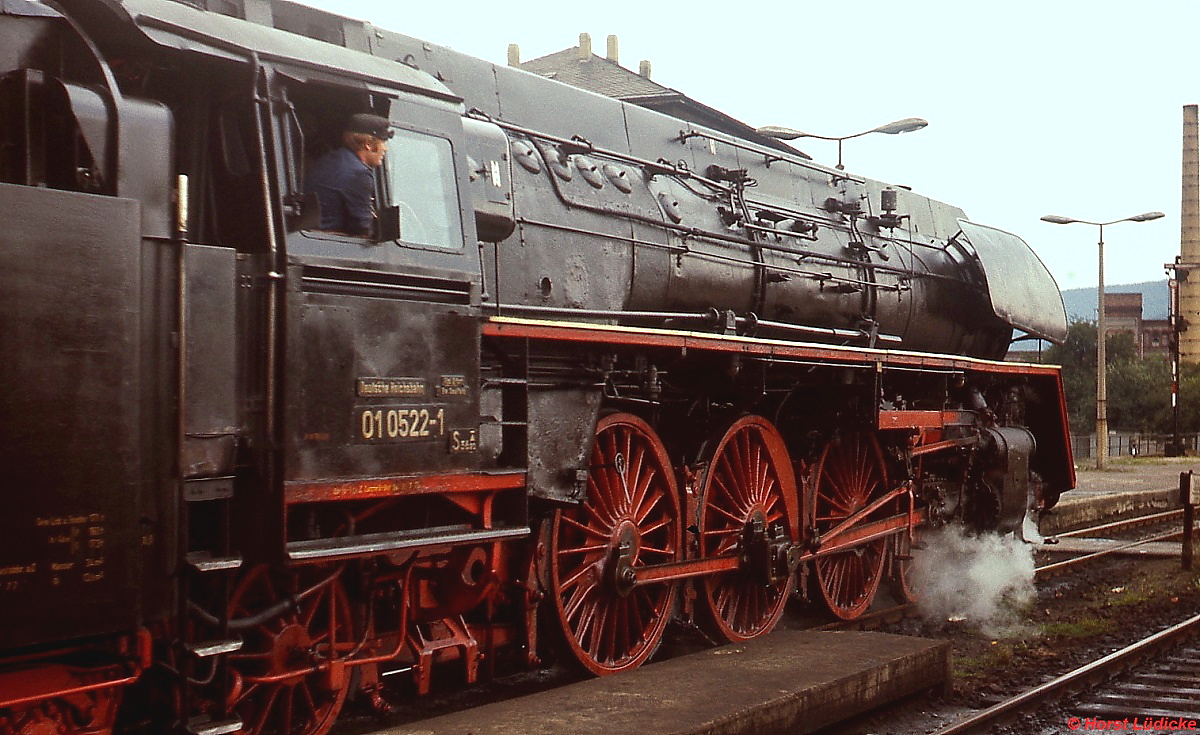 Im August 1977 verläßt 01 0522-1 mit einem Personenzug nach Jena den Bahnhof Saalfeld