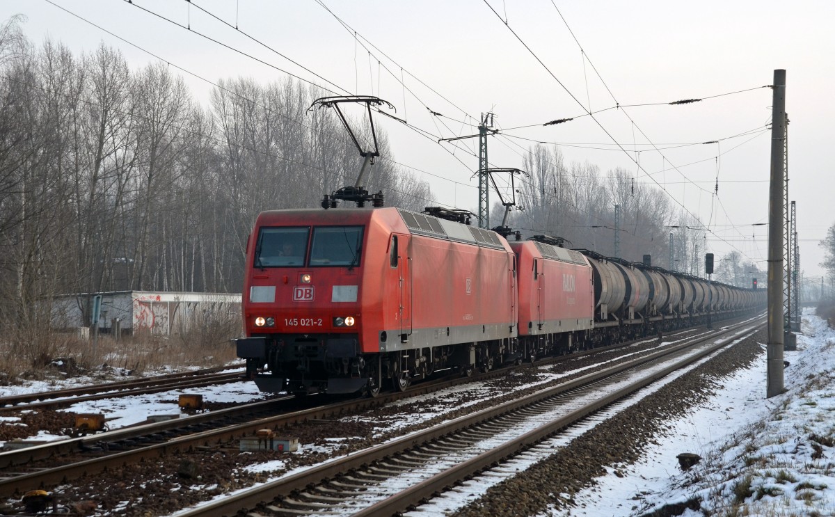 Zusammen mit ihrer Schwester 145 059 bespannte 145 021 am 31.01.14 einen Kesselwagenzug. Hier ziehen beide ihren Zug durch Leipzig-Thekla Richtung Mockau.