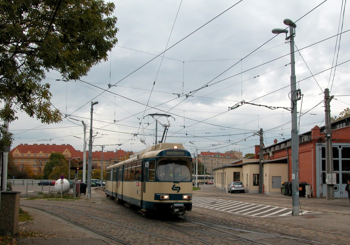 Wien Wiener Lokalbahn am 20. Oktober 2010: Der Gelenktriebwagen 4-101 der SGP-Reihe 100 verlässt gerade den Betriebsbahnhof in der Wolfganggasse.