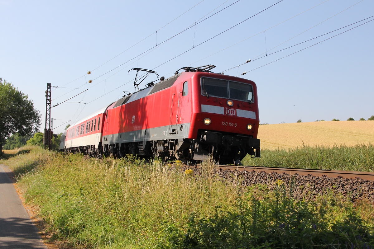120 151-6 mit einem AZ aus Richtung Süden kommend. Aufgenommen zwischen Eschwege und Albungen am 19.07.2013.