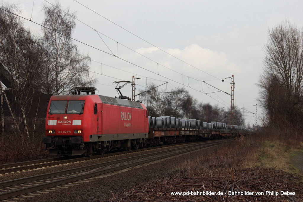 145 029-5 (Railion DB Logistics) mit einem Güterzug in Bottrop Welheim, 25. Januar 2014