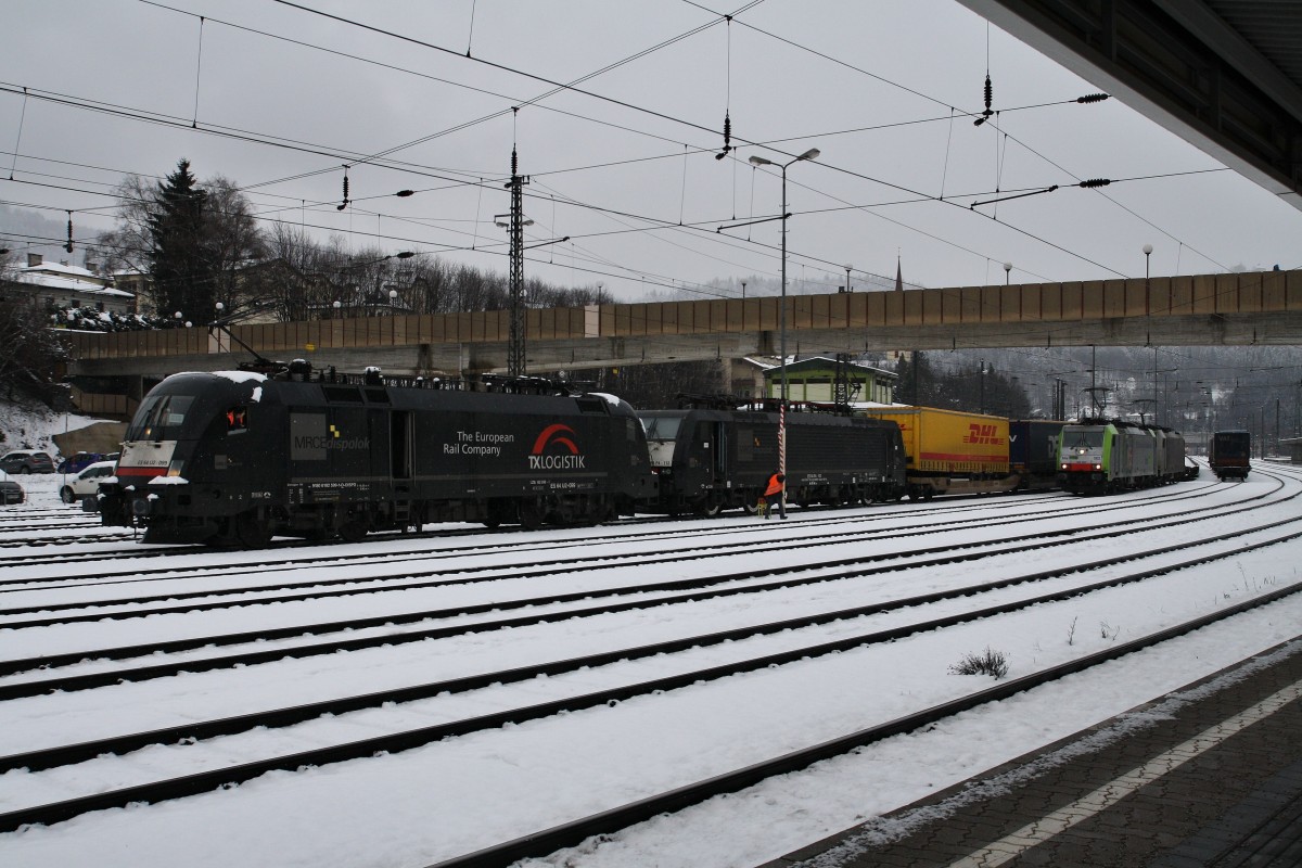 182 599-1 und 189 112-6 von TXL stehen mit einem KLV am 26.1.2014 im Bahnhof Kufstein und warten auf die Ausfahrt Richtung Brenner. Nebenan stehen 486 502-8 der BLS und 186 284-6 von LM.