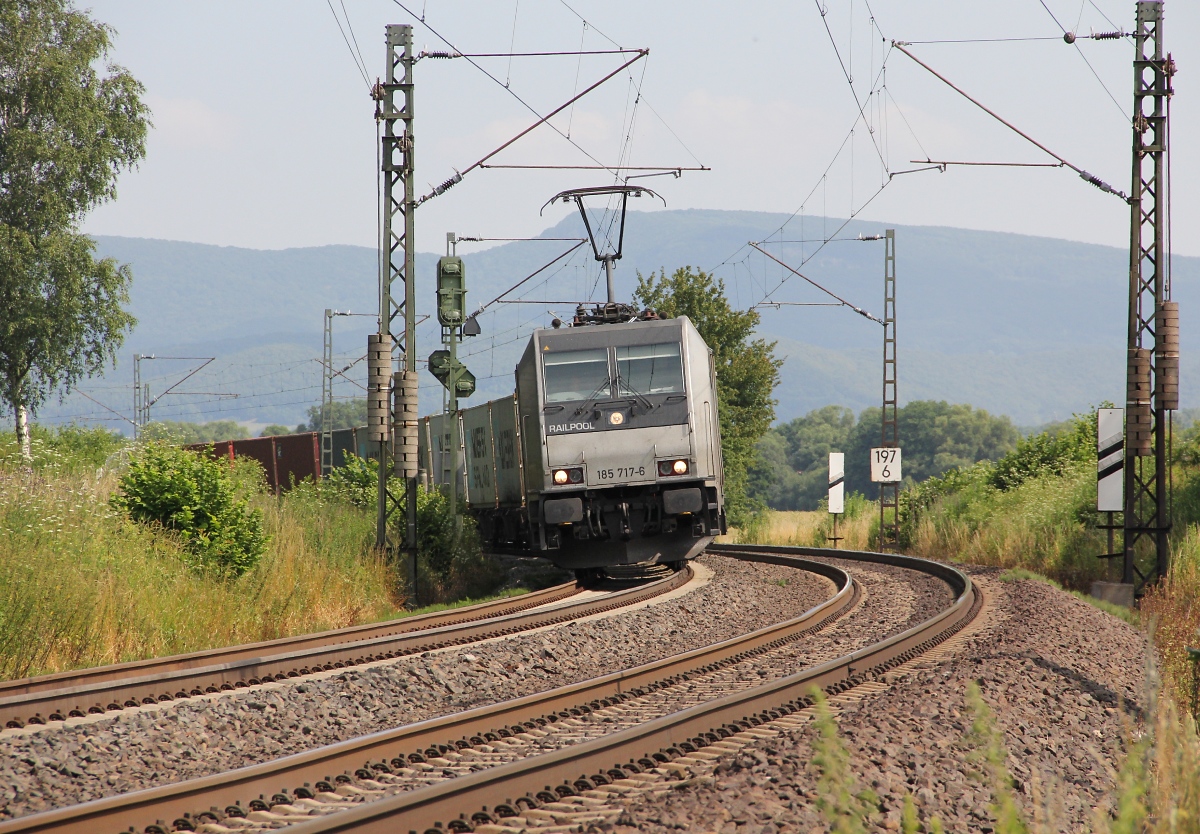 185 717-6 legt sich mit ihrem Containerzug vor Wehretal-Reichensachsen in Fahrtrichtung Süden in den Gleisbogen. Aufgenommen am 17.07.2013.