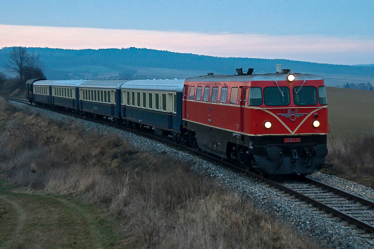 2050.09 bringt ihren Sonderzug zur Veranstaltung "Wandern und Wein im Fackelschein" von Wien Praterstern nach Ernstbrunn. Die Aufnahme entstand am 25.01.2014 zwischen Stetten Fossilienwelt und Rückersdorf-Harmannsdorf.