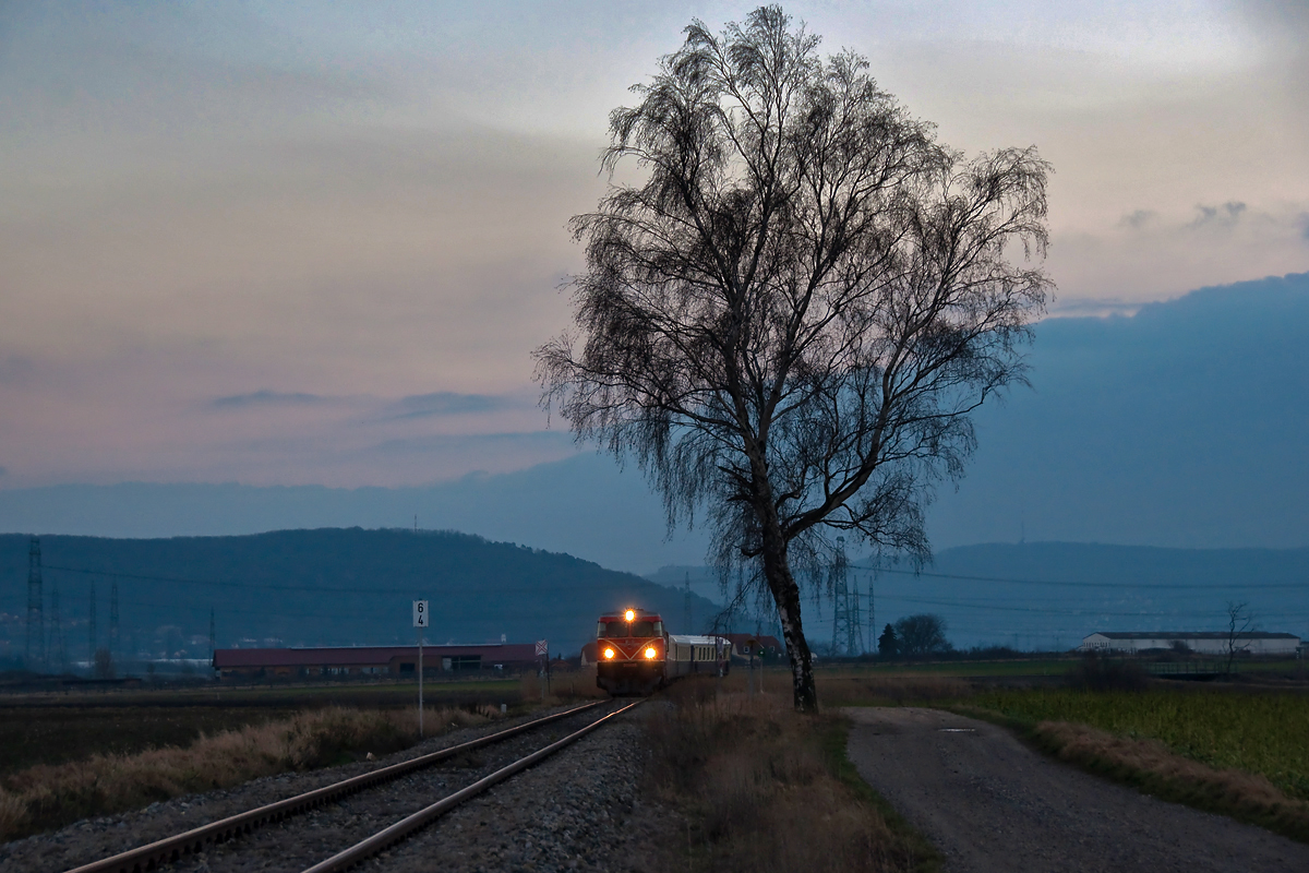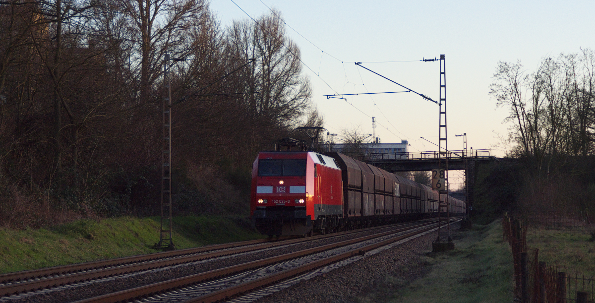 Kurz vor Sonnenuntergang ist der Kohlenleerzug in Richtung Ruhrgebiet unterwegs.