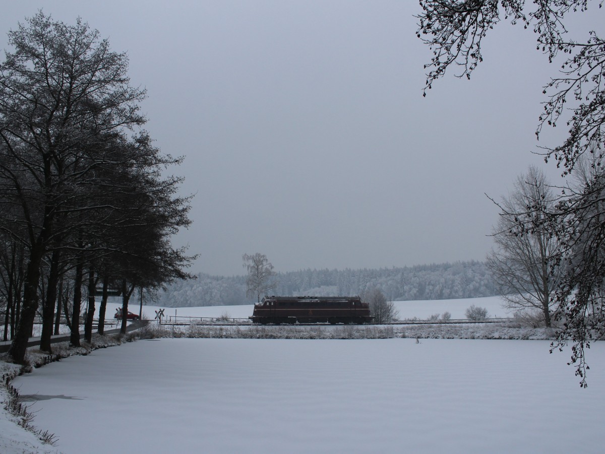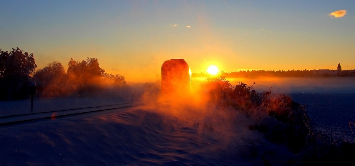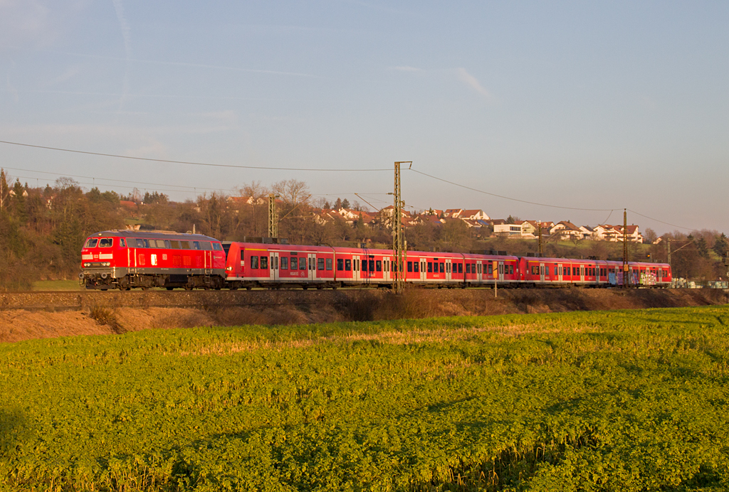 Heilige Kuh unterwegs: Am späten Morgen des 12. Januar 2014 verendete ein 425-Doppel auf der schwäbischen Alb bei Lonsee. Aus Plochingen eilte 218 191 heran, um die beiden Havaristen abzuschleppen. Es sollte dann allerdings bis in die Mittagsstunden hinein dauern, bis sich die als Lr 70661 bezeichnete Fuhre in Richtung Plochingen aufmachen konnte. Kurz vor "Lichtaus" gelang mir bei Ebersbach noch diese Aufnahme.