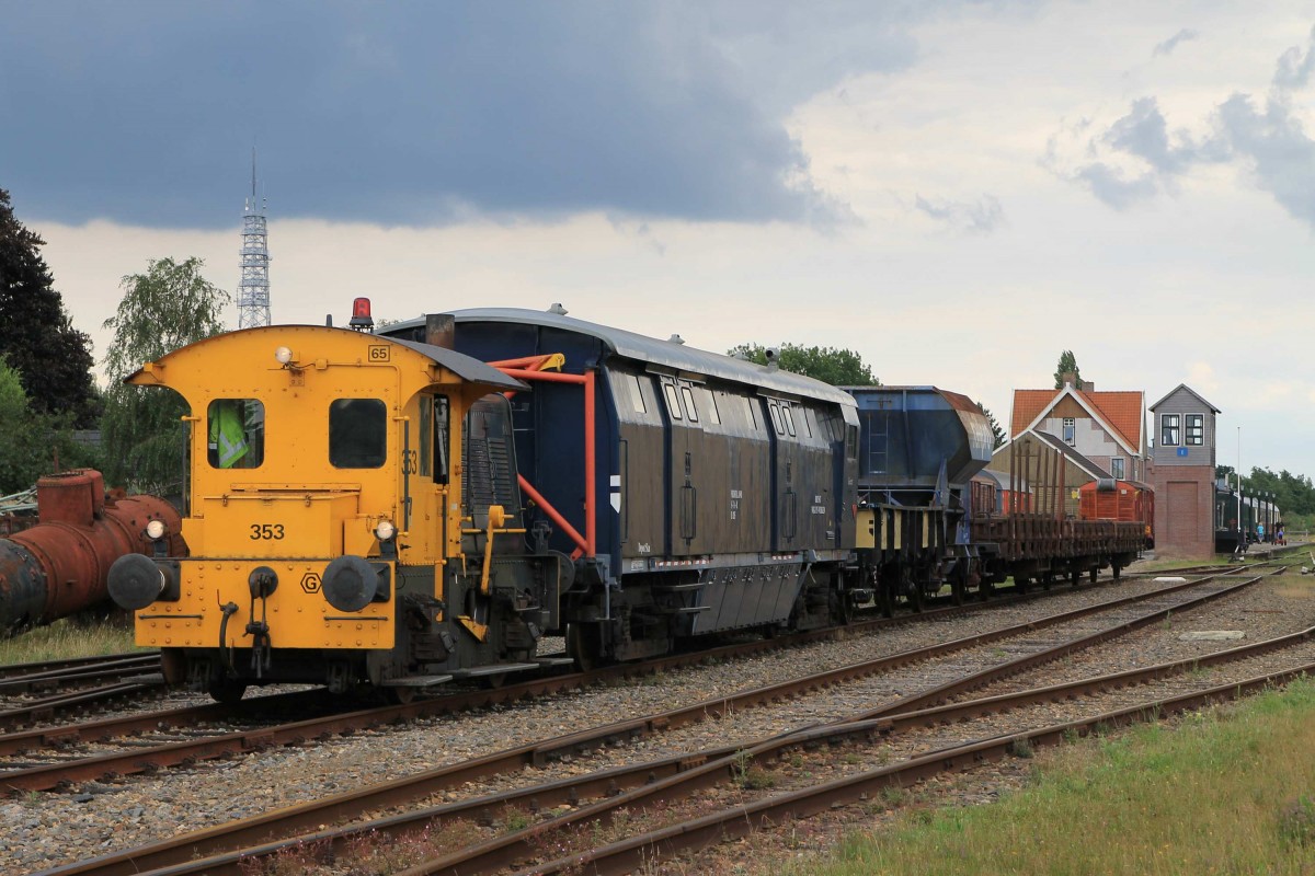 လSikဝ 353 der Stichting Stadskanaal Rail (STAR) mit einem Bauzug auf Bahnhof Stadskanaal am 10-08-2013.