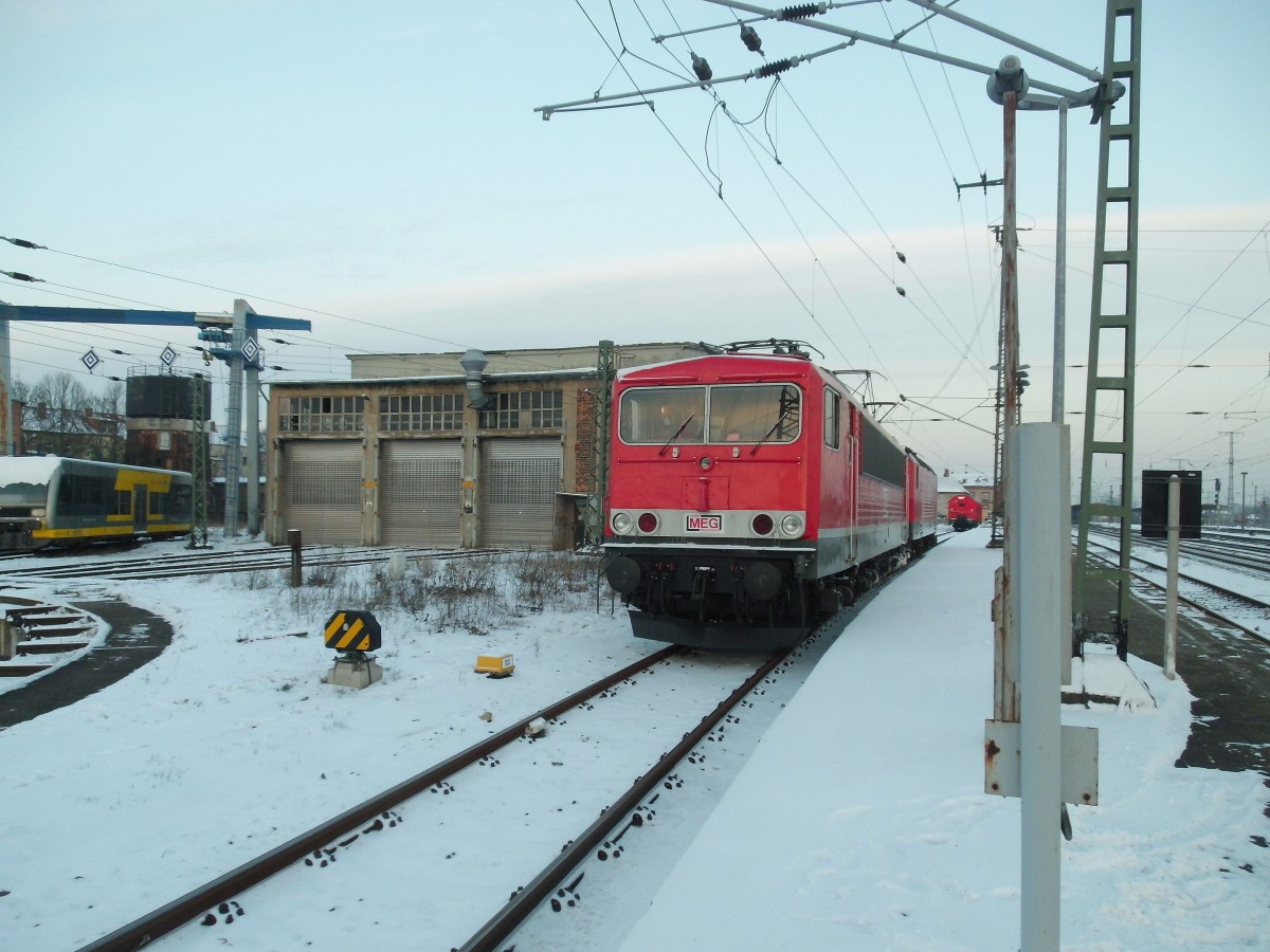 Am 25.01.2014 kam MEG 601 (143 179)mit MEG 708(155 046)nach Stendal.Die MEG 706(155 119)wurde von der MEG 601(143 179)aus dem Bw Stendal geholt und mit in den Zugverband eingebaut.Hier steh ich am Bahnsteig 7.