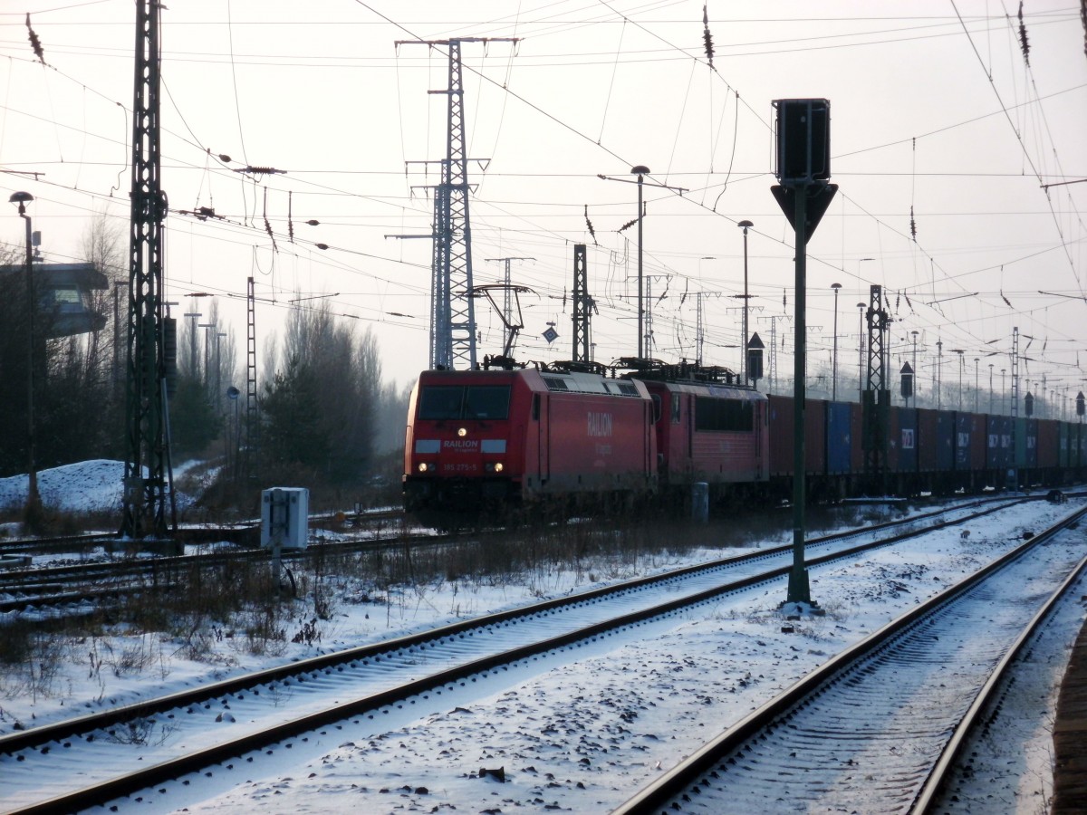 Am 26.01.2014 kam 185 275 mit 155 158 und einem Containerzug durch Stendal und fuhr weiter in Richtung Magdeburg.