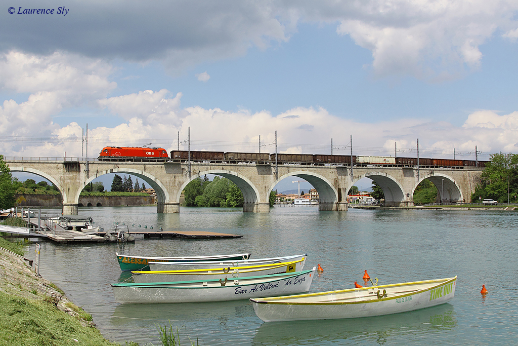 An OBB class 1216 crosses the viaduct at Peschiera del Garda with a freight train to Lonato, 20 May 2013.