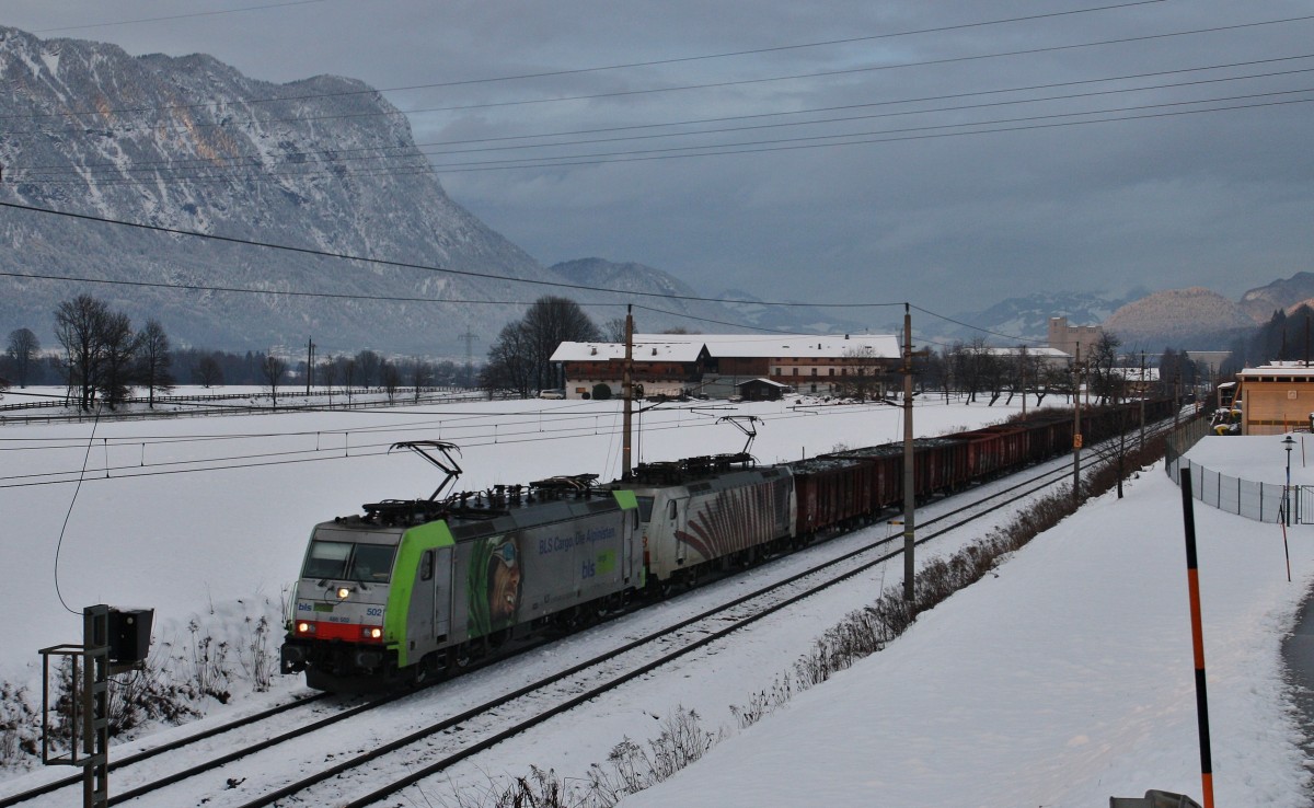 Der tägliche Schrottzug nach Italien. Hier fahren die 486 502-8 von BLS(angemietet von LOMO) und 189 918-6 von LOMO mit dem Schrottzug am 26.1.2014 durch das Unterinntal bei Kichbichl Richtung Brenner. Endlich ist auch der Schnee in Tirol angekommen :-). Grüße an den TF!
