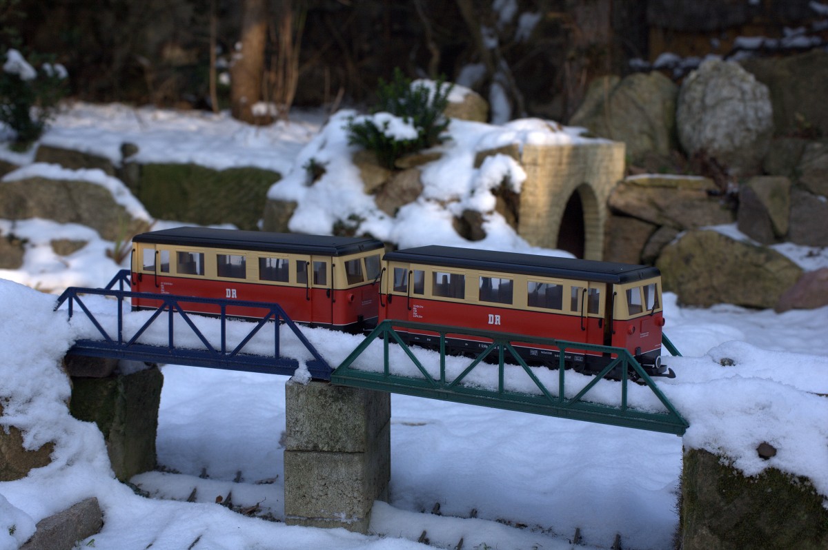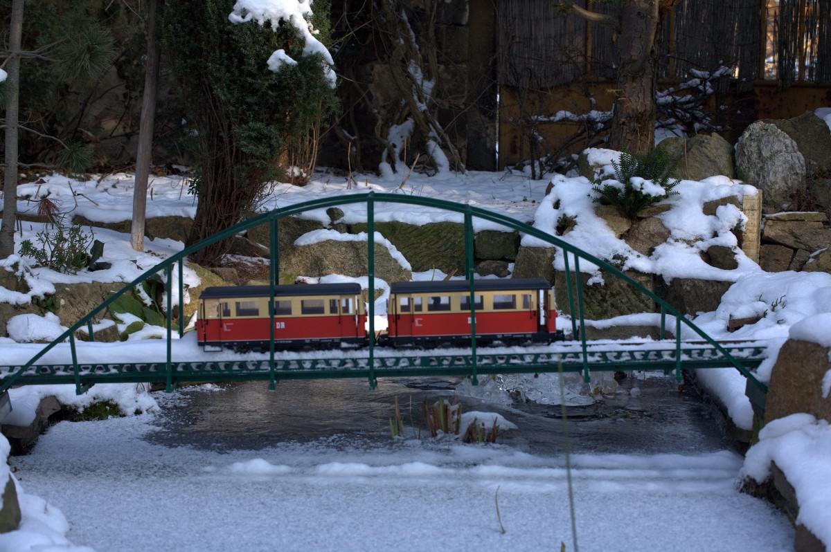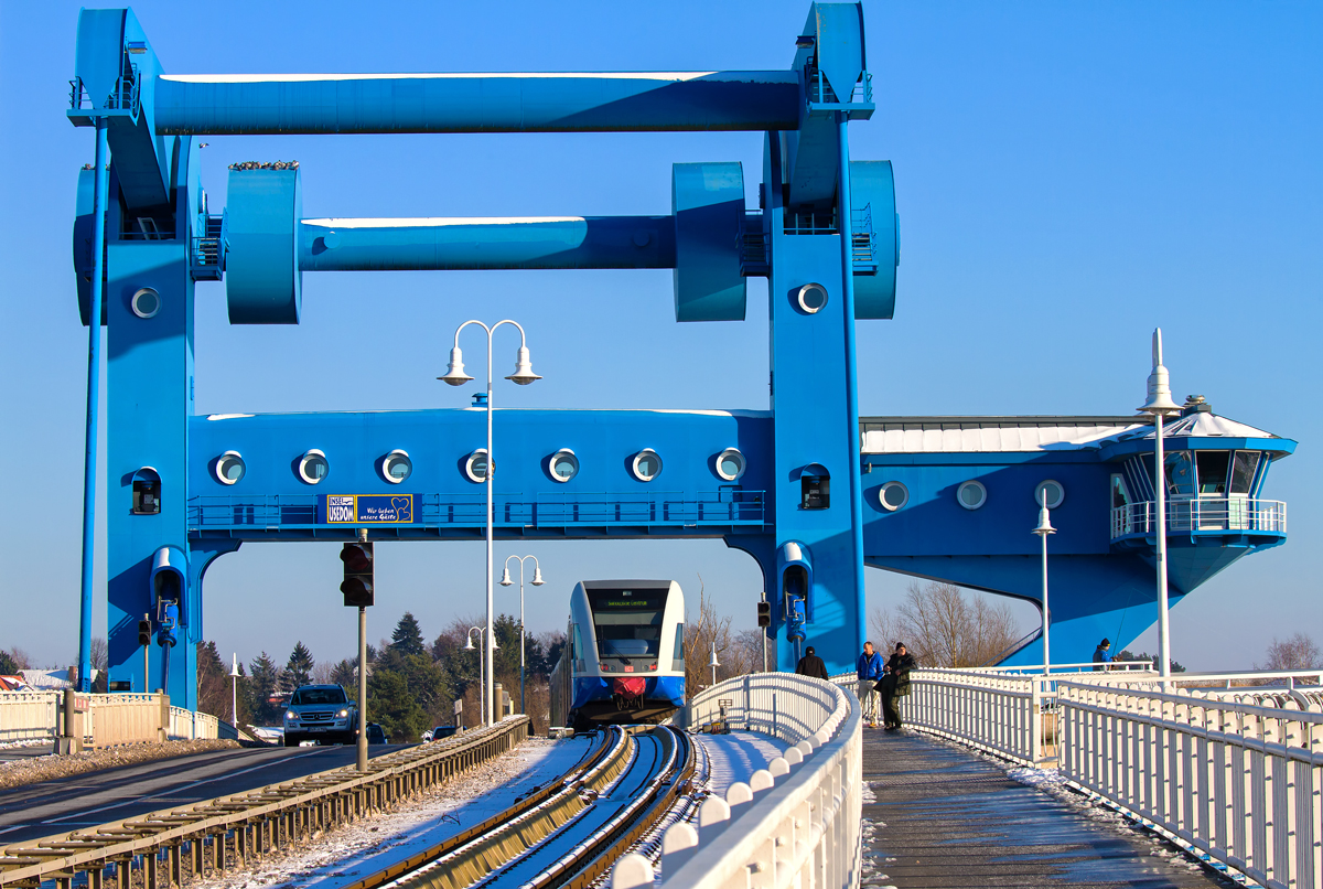 Der UBB Triebwagen fährt über die Wolgaster Peenebrücke bis Swinemünde Centrum. Die -9 °C scheinen Angler und eine Schar Tauben auf der Brücke zum Sonnen zu nutzen. - 24.01.2014