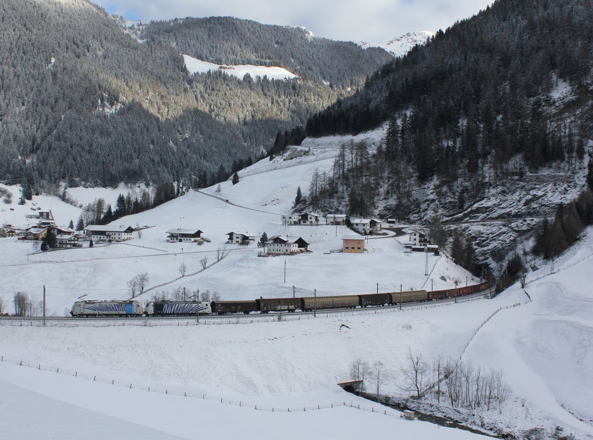 Die 186 102 und die 185 662 mit einem Güterzug am 25.01.2014 unterwegs bei St. Jodok.
