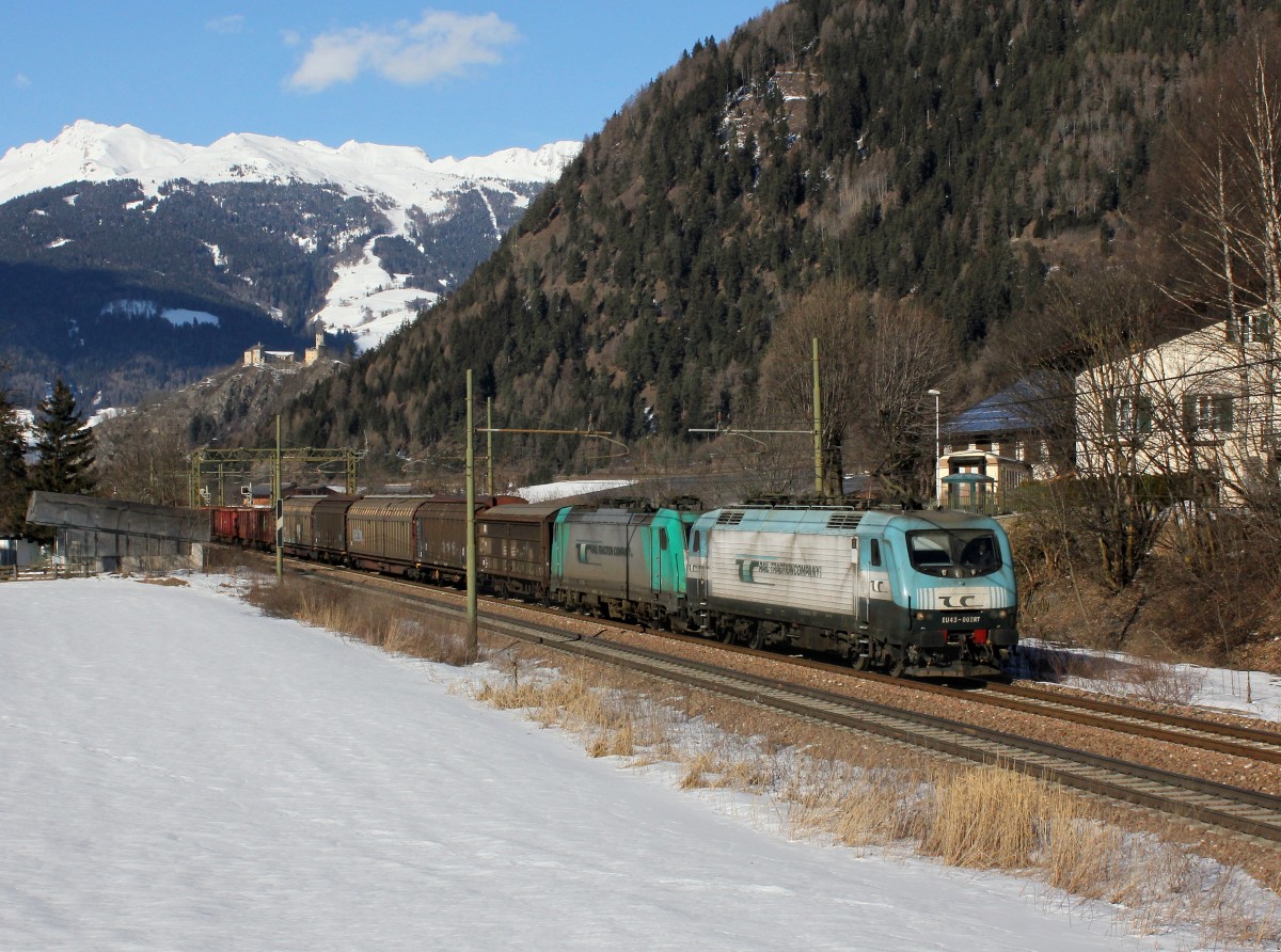 Die EU 43 002 und die E 483 002 mit einem Güterzug am 25.01.2014 unterwegs bei Campo di Trens.