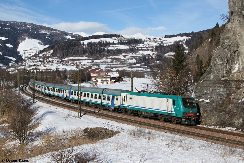 Die 1216 011 mit einem Brenner EC am 25.01.2014 unterwegs bei Sterzing.