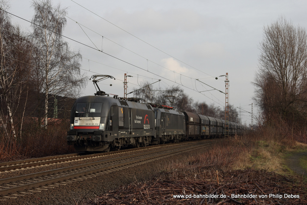 ES 64 U2 - 012 (TXLogistik) und ES 64 F4 - 102 mit einem Kohlezug in Bottrop Welheim, 25. Januar 2014