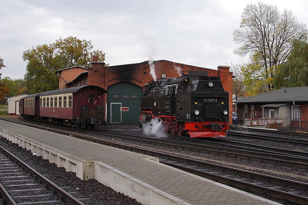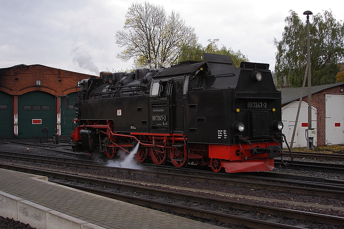 Nachdem 99 7247 am 20.10.2013 einen Sonder-PmG der IG HSB von Wernigerode nach Gernrode gebracht hat, rollt sie jetzt, am späten Nachmittag, zur Abstellung am Lokschuppen im Bahnhof Gernrode.