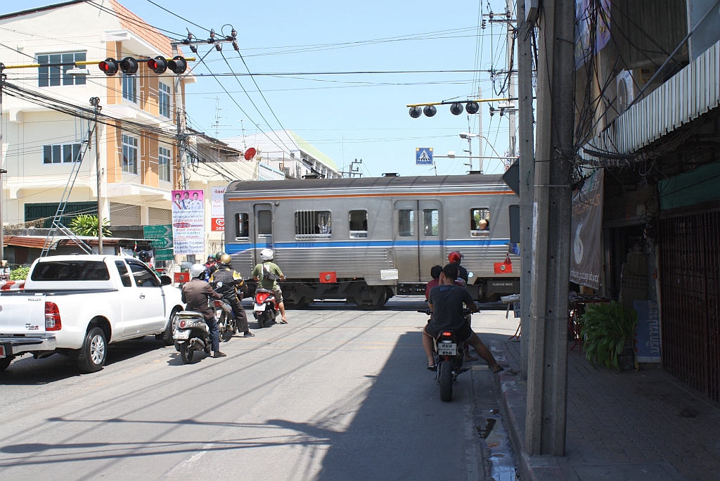 ORD 4323 von Wongwian Yai nach Mahachai quert am 01.Juni 2013 die EK mit der Thanon Ekkachai.