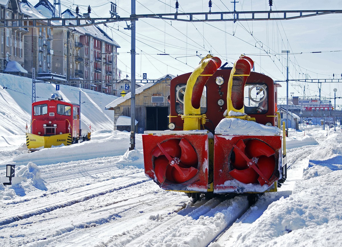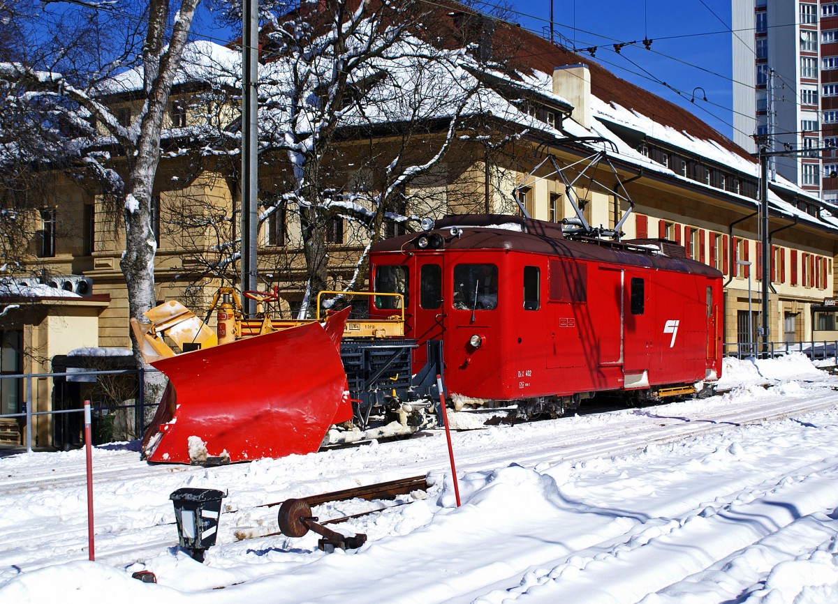 SBB/CJ/: Kampf gegen den Schnee auf normaler und schmaler Spur in La Chaux-de-Fonds am 25. Februar 2009. Nach einer harten Schneeräumungsfahrt durch den Jura gönnt sich der CJ-De 4/4 402 samt Schneepflug eine Pause an der Sonne vor dem nostalgischen Bahnhofsgebäude La Chaux-de-Fonds. Inzwischen leistet er wertvolle Dienste im Berner Oberland bei der MIB.
