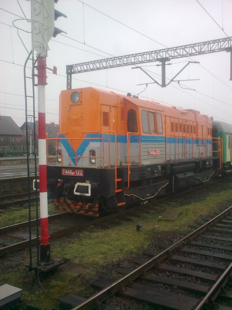 Tschechische T448p-122 (eigentlich bereits seit 1988 Baureihe 740) der Tschechischen Eisenbahn vor einem Bauzug mit österreichischen Waggongs am 15. Januar 2014 im Bahnhof von Kandrzin-Cosel (Kedzierzyn-Kozle) im polnischen Teil Oberschlesiens.