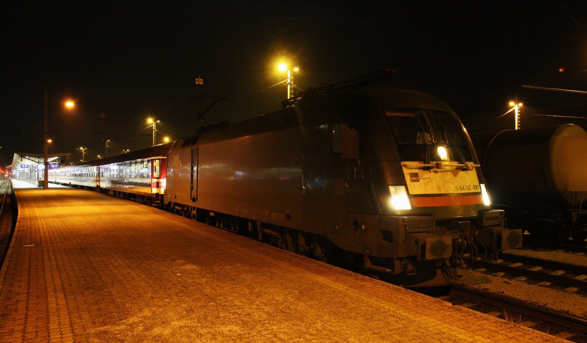 Am späten Abend des 11.1.2014 wartet der Schnee-Express mit 182 597-5 von MRCE in Wörgl auf seine Heimreise von Bludenz/Mallnitz Obervellach nach Hamburg. Er wurde in Wörgl zusammengestellt und verlässt gegen 22 Uhr mit 4 min Verspätung den Bahnhof. Mit 14 Wagen geht es nach Hause.