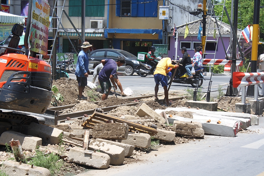 Bei der EK mit der Thanon Ekkachai werden zwischen den Zugfahrten die Schwellen gewechselt. Bild vom 01.Juni 2013.
