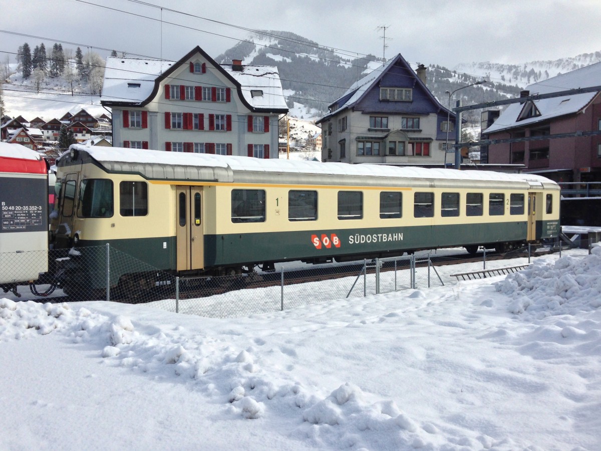Der letzte seiner Art: ABt 50 48 39-35 154-2 steht ebenfalls abgestellt in Nesslau neu St. Johann. Die BDe Pendel prägten Jahre lang das Bild der SOB. Seit der Ablieferung der FLIRT war noch ein Pendel als Reserve in Samstagern stationiert. Doch auch dieser ist nun Geschichte..., 27.01.2014.