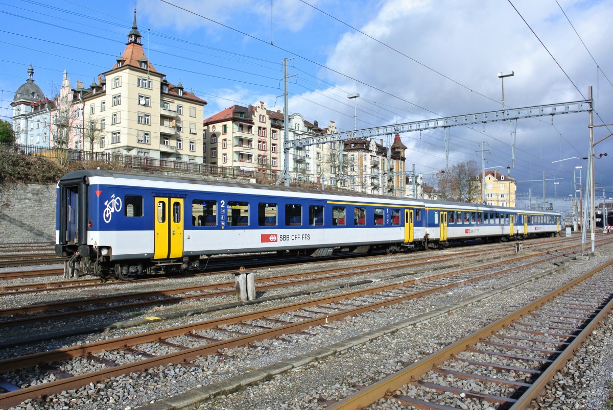 Drei SBB AB NPZ stehen abgestellt im GB St. Gallen. AB EWII 50 85 39-35 086-0, AB EWI 50 85 30-35 251-9 und AB EWI 50 85 30-35 260-0 (ex. TILO). Diese Wagen werden vorläufig nicht gebraucht, 27.01.2014.