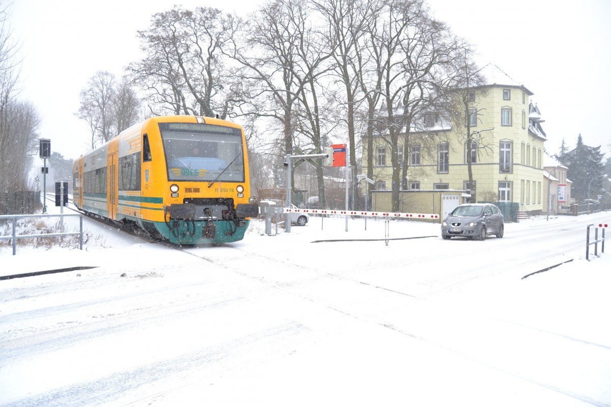 ODEG VT 650 bei Schneefall. Innerhalb 5 stunden ist am 27.01.2014 ca. 1.5 cm Schnee gefallen. Die ODEG vor dem BÜ in Niederlehme