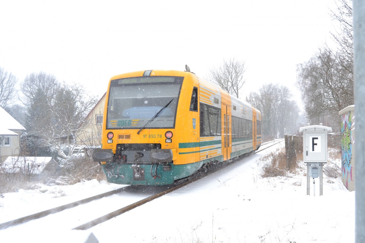 ODEG VT 650 bei Schneefall. Innerhalb 5 stunden ist am 27.01.2014 ca. 1.5 cm Schnee gefallen. Die ODEG kurz nach dem BÜ in Niederlehme richtung Königs Wusterhausen.