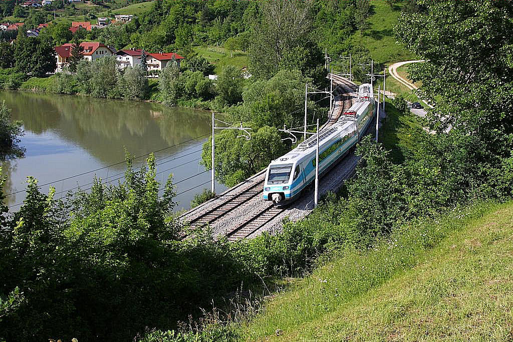 die Savinja herum. Unterhalb der Kirche ist am 29.5.2011 ein Pendolino der SZ nach Lubljana unterwegs.