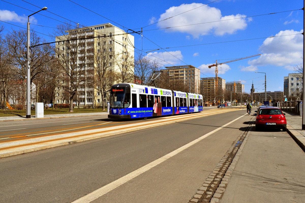 Tw 289 der Freiburger Straßenbahn erreicht am 02.01.2014 die Haltestelle Hauptbahnhof, im Hintergrund die 1897 geweihte, im Stil des Historismus gebaute Herz-Jesu-Kirche