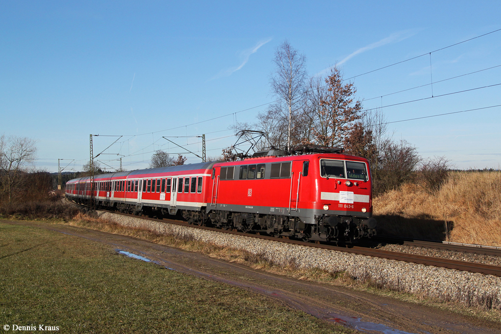 Nachschuss auf RE 26510 (Basel Bad Bf - Offenburg) am 06.01.2014, als dieser Ersatzweise mit 143 332-5 und 143 810-0 in Sandwich-Traktion kurz hinter Müllheim (Baden) gen Freiburg fuhr.