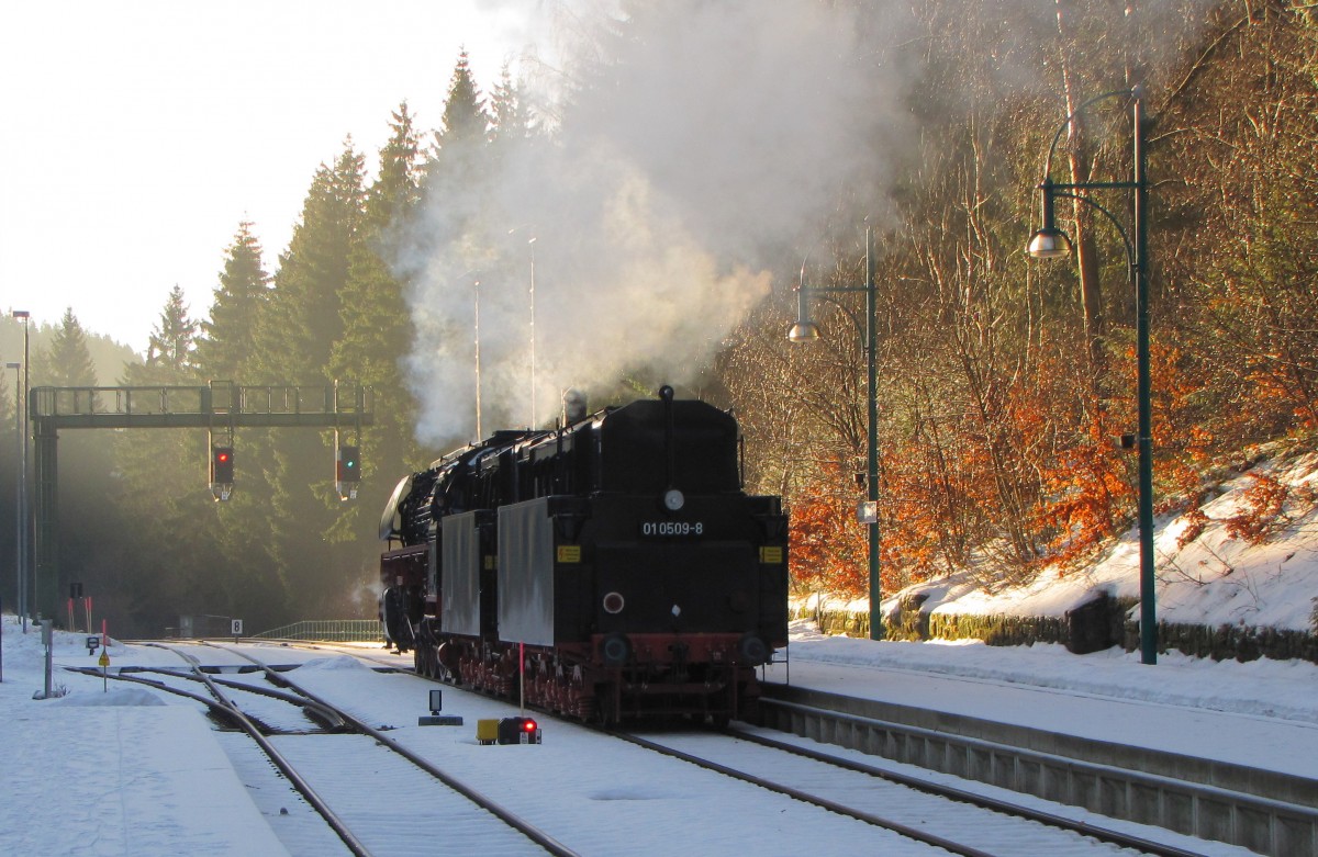 Ende des Dreikönigsdampf auf der Schwarzwaldbahn. 01 150 passiert die Neckarquelle beim Schwenniger Eisstadion auf dem Weg nach Hause. Die badischen Gefielde hat sie zwei Minuten zuvor verlassen. Januar 2013.