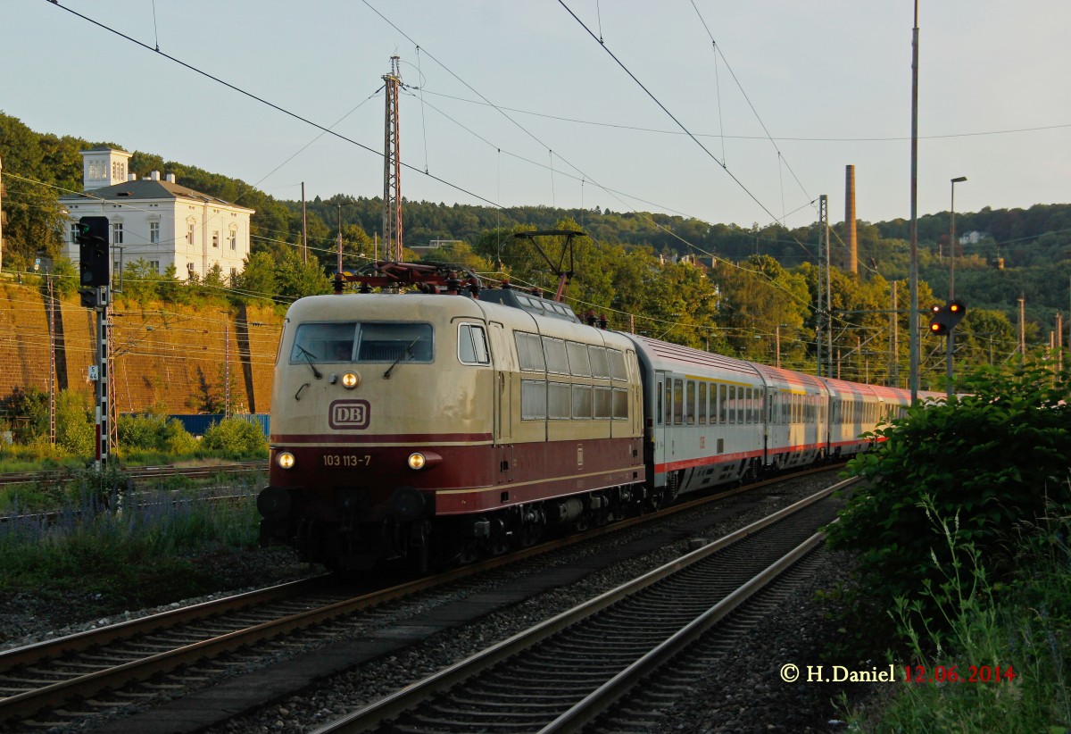 103 113-7 mit IC 118 am 12.06.2014 in Wuppertal Steinbeck. Der Zug wurde wegen Unterwetterschäden über Wuppertal-Hagen nach Münster umgeleitet.