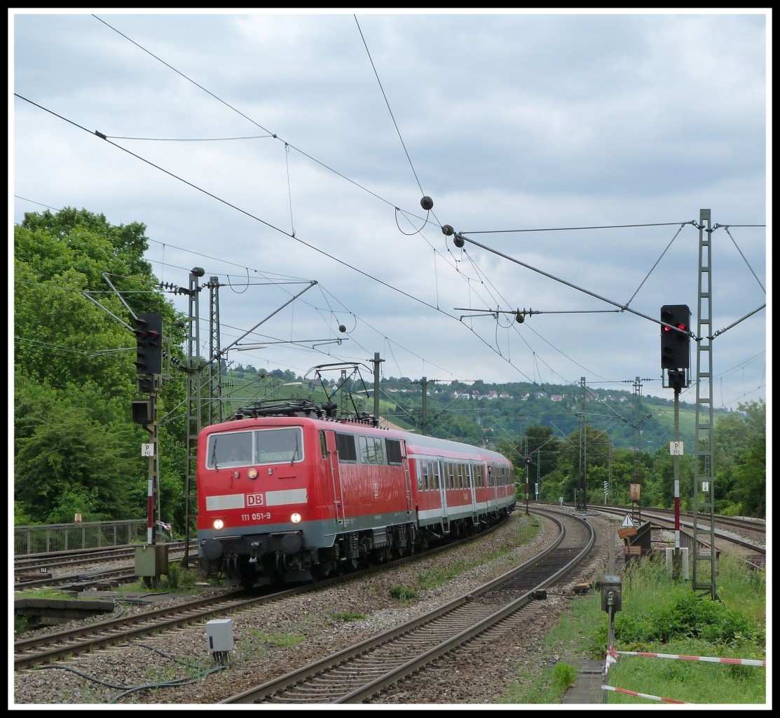 111 051 durchfährt am 30.5.14 mit einem RE den Bahnhof von Stuttgart Untertürkheim und wird nach einem letzten Stop in Cannstatt in wenigen Minuten den Hauptbahnhof von Stuttgart erreichen.