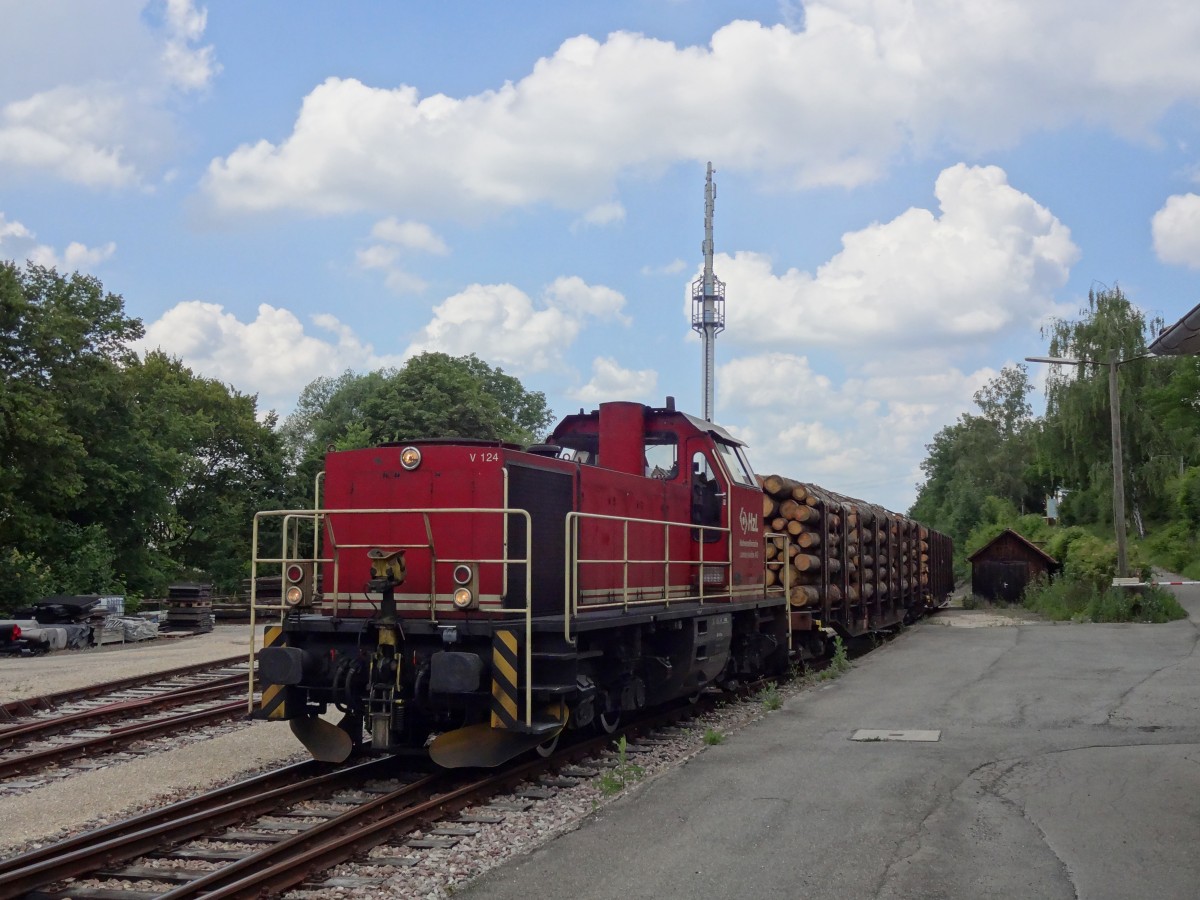 Am 24.6.14 fuhr V124 alias 212 910 mit einem Holzzug in Richtung Gammertingen davon.