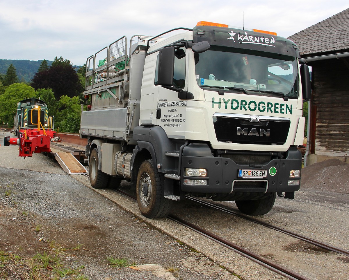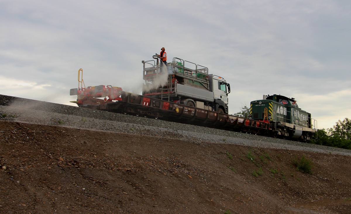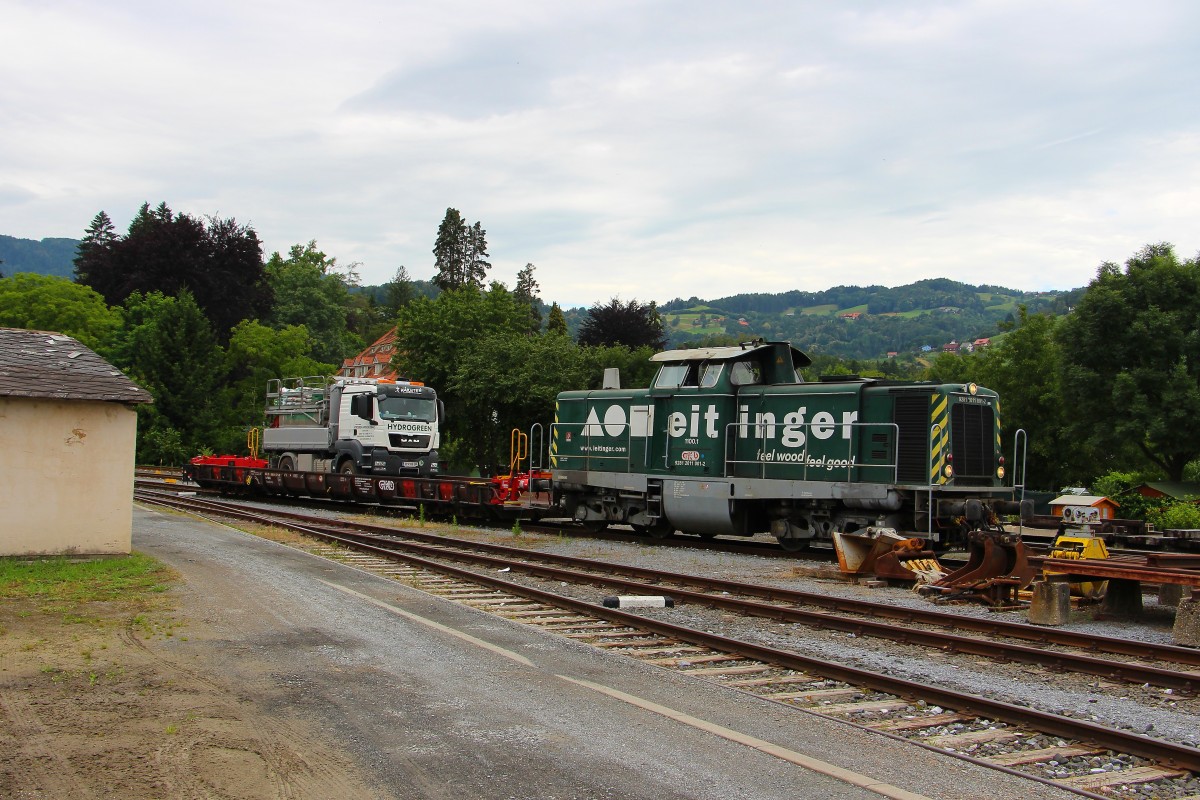 Erster Einsatz des Umgebauten Rola-Wagens (Saadkms) der GKB. Hier zu sehen die Verladung eines Spezial Lkw,s zur begrünung des Bahndamms entlang der 1,7 Kilometer langen Baustelle bei Deutschlandsberg. 1.Juli 2014
