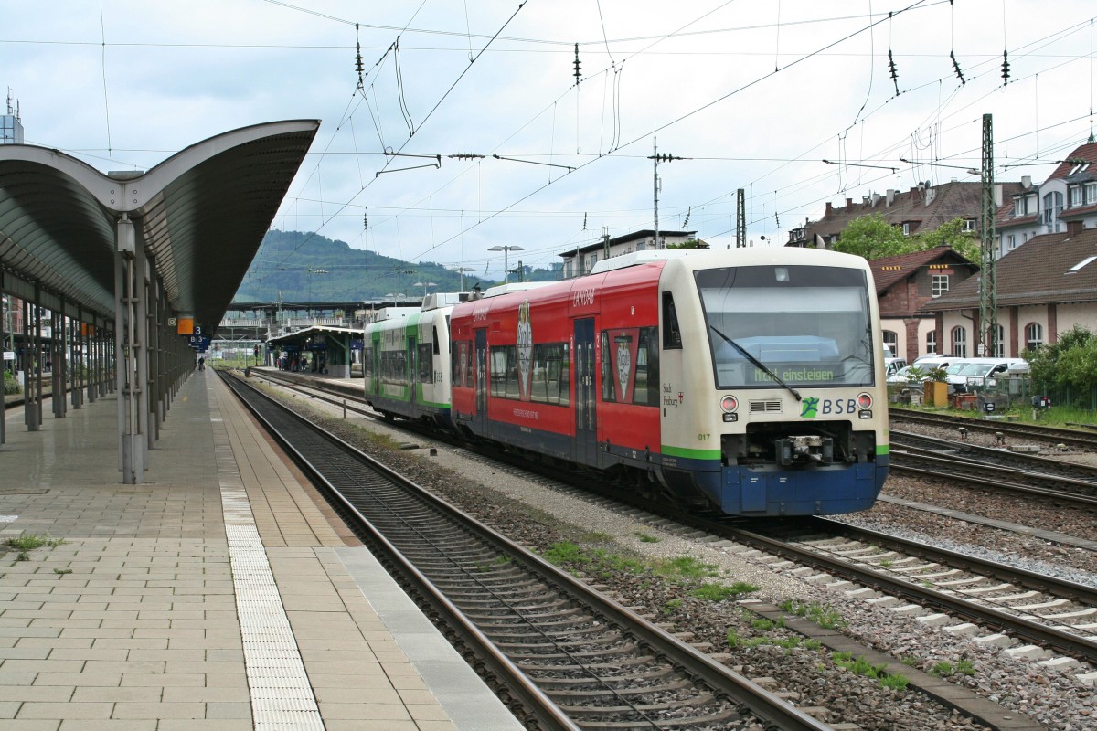 BSB-VT017 und BSB-VT 001 bei der Einfahrt aus Richtung Elzach in Freiburg (Breisgau) Hbf. Das Bild entstand am Nachmittag des 03.05.14.